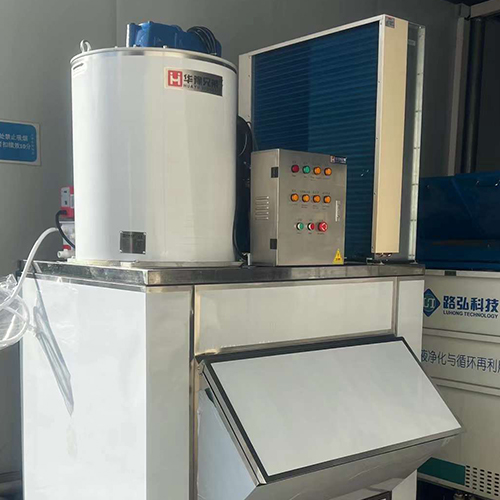 我們都知道片冰機的重要組成部分主要有蒸發器,壓縮機,冷凝器,減速機及電機,電箱,儲冰庫等部件,其中冷凝器主要擔負制冰的重任,制冰原理就是水通過進水口,輸送至水箱,在通過水泵將水抽到片冰機分水盤,分水盤里的水通過灑水管將水均勻地灑到蒸發器內壁上,形成水膜;這時水膜與蒸發器流道中的制冷劑進行熱交換,溫度迅速降低,在蒸發器內壁上形成一層冰膜;這時在逆時針旋轉的不銹鋼冰刀的擠壓下,碎裂成冰片,片冰從落冰口落入儲冰庫。部分未結成冰的水通過接水盤從回水口回流至水箱,再通過水循環泵抽到分水盤,循環制冰。